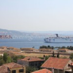 Viele Schiffe weil hier die großen Ozeanschiffe auf dem Weg vom Mittelmeer durchs Marmarameer zum Schwarzen Meer hier die Engstelle, die Dardanellen passieren.